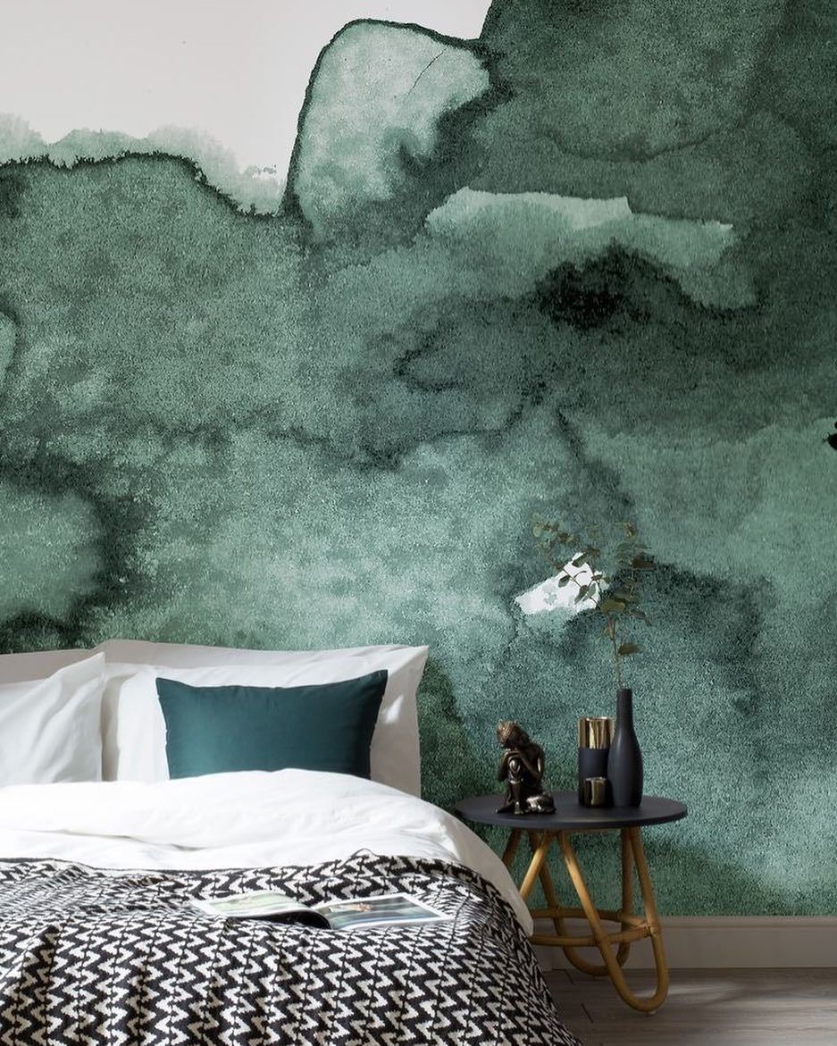 Watercolor walls in a serene green. photo via @muralswallpaper